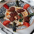 Atlantic lobster tail poached in herb butter, served with saffron risotto and asparagus spears.